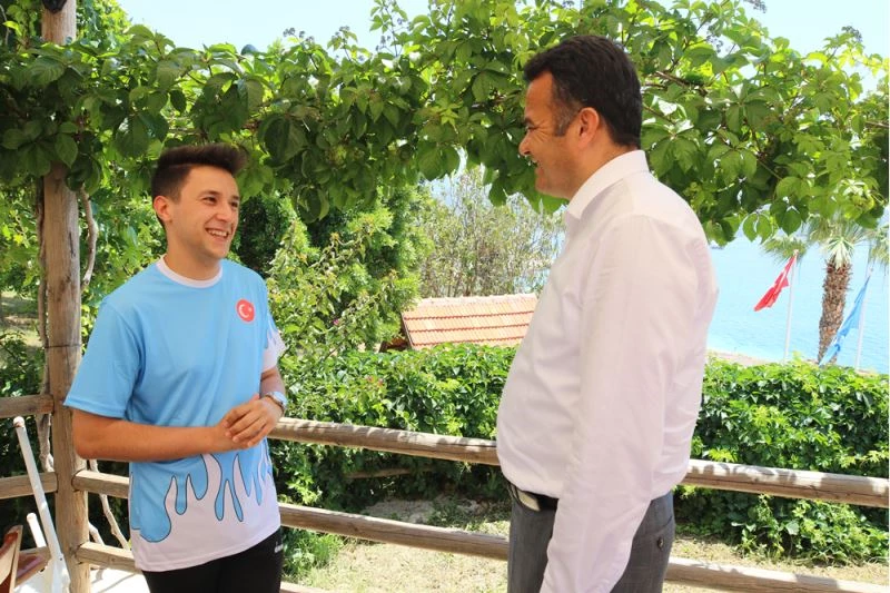 Başarılı sporcu Coş, İlçe Belediye Başkanı Mutlu Ulutaş'ı ziyaret ederek, spora ve sporcuya verdiği destekten dolayı Ulutaş'a teşekkür etti.