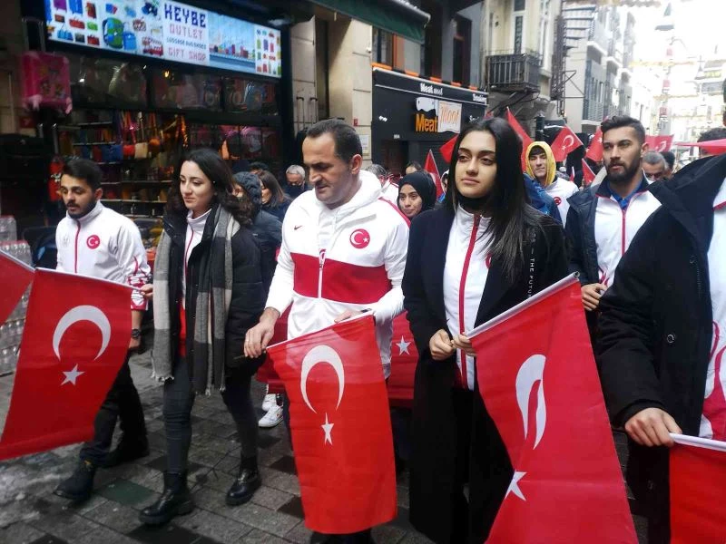 Beyoğlu’nda İstiklal Marşı’nın kabulünün 101’inci yıl dönümünde milli sporcular ile gençler hep birlikte İstiklal Marşı’nı okudu.