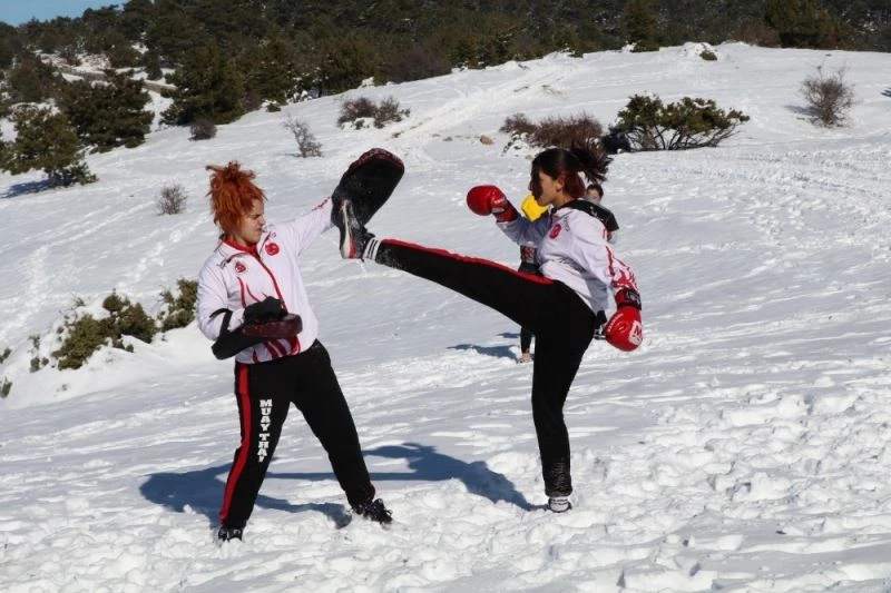 Manisa’nın Türk sporuna kazandırdığı milli Muay Thai sporcuları, yeni hedeflere sıkı bir tempoda hazırlanıyor. Kar kış demeden çalışan başarılı sporcular, karla kaplı Spil Dağı’nda güç depolayıp stres attı.