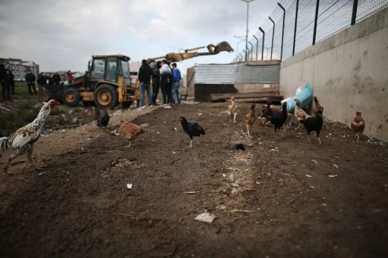 Mahalle sakinlerinin araziye yaptığı kümesler yıkılırken, tavukları ise hiçbir şeyden habersiz, iş makinaları ve ekiplerin arasında gezmesi dikkat çekti. Kazların bulunduğu kümesin yıkılmasını istemeyen sahipleri, kısa süre direndi. Daha sonra kaz ve tavuklar kümesten ekipler tarafından araziye salınırken, kümes iş makinasının yardımı ile yerle bir edildi.