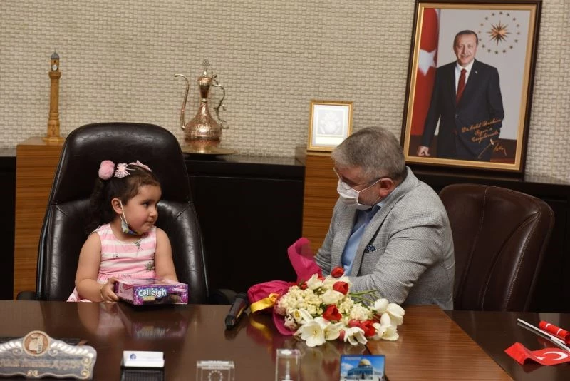 Çorum Belediyesi Buhara Kültür Merkezi Kreş öğrencileri 23 Nisan Ulusal Egemenlik ve Çocuk Bayramı nedeniyle Belediye Başkanı Dr. Halil İbrahim Aşgın’ı makamında ziyaret etti. Minikler Başkan Aşgın’a çiçek takdim etti, ardından ufak bir gösteri sundu. 23 Nisan Başkanı olarak makam koltuğuna oturan Aymina Buluş ise yol ve park yapmak istediğini söyledi.