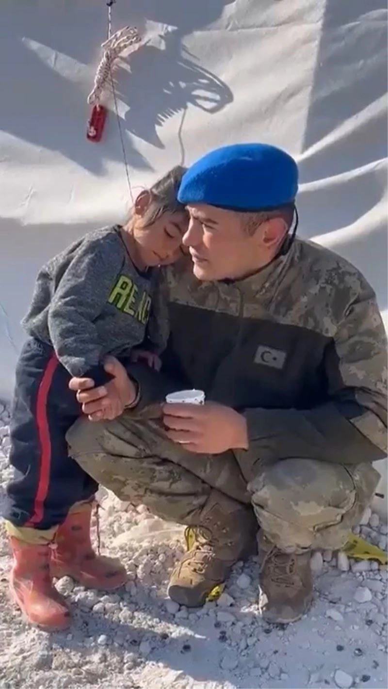 Deprem bölgesindeki minik bir kız çocuğu, yere çökmüş Mehmetçiğin omzuna yattı.