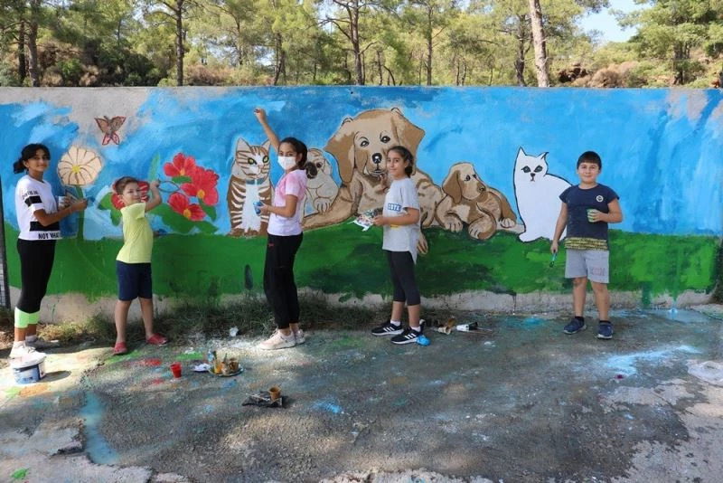 Minik ressamlar, Marmaris Belediyesi Geçici Hayvan Bakımevi’nin duvarlarını kedi, köpek, çiçek gibi figürler çizerek rengarenk boyadı.