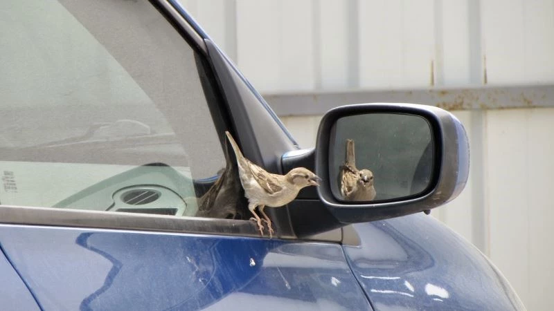 Çanakkale’de bir serçenin otomobilin yan aynasında kendisiyle oyunu görenleri gülümsetti.