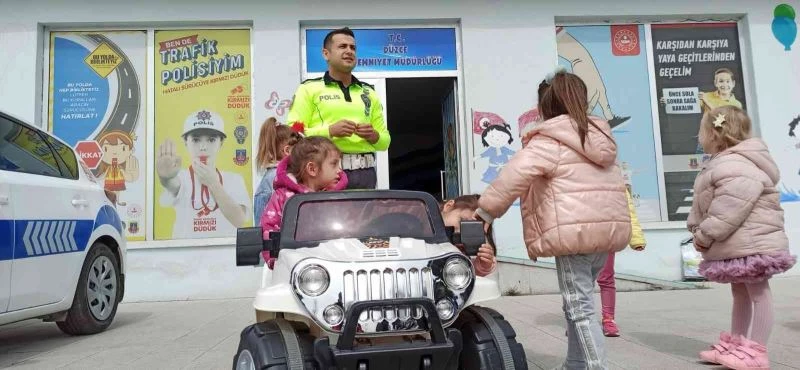 Düzce’de Polis Haftası etkinlikleri çerçevesinde anasınıfı öğrencilerine trafik eğitimi verildi. Minikler hem Polis Haftası’nı kutladı hem de trafik kurallarını öğrendi.