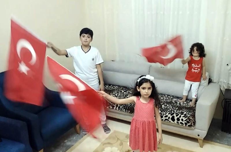 Korona virüs tedbirleri kapsamında evden çıkamayan minik öğrenciler 19 Mayıs’ı ellerine aldıkları bayraklarla evde kutladı.