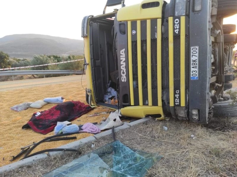 Aydın’ın Buharkent ilçesinde seyir halindeki çekici şarampole devrildi. Dorsesinde mısır yüklü olan çekicinin sürücüsü olay yerinde hayatını kaybetti.