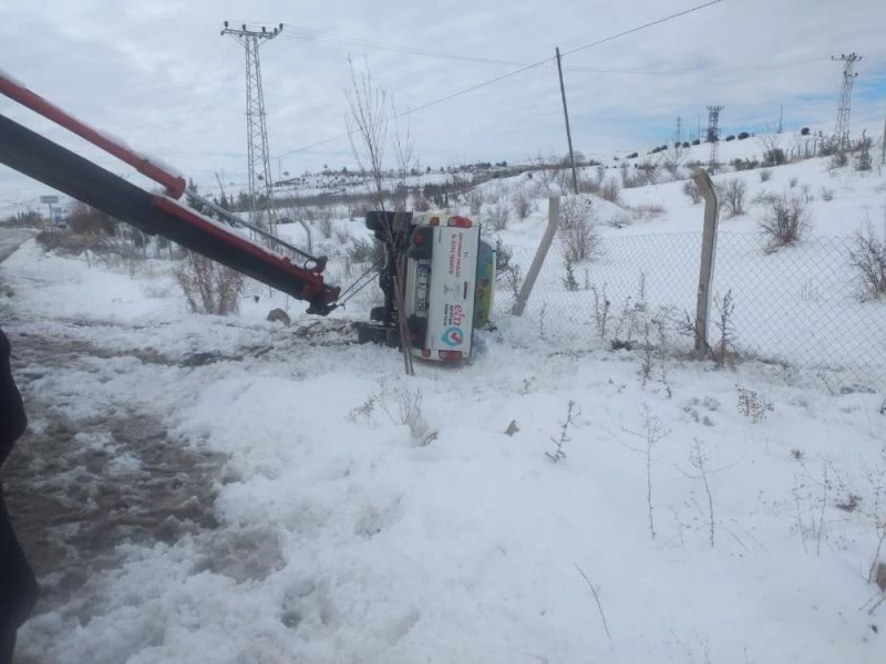 Adıyaman’ın Gölbaşı ilçesinde yağan kardan dolayı mobil EBA aracı kayarak devrildi.
