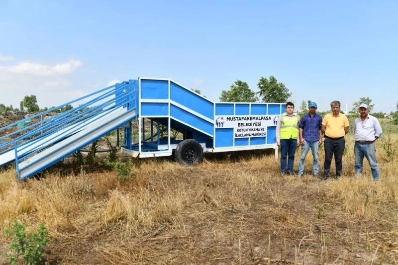 Kurban bayramının yaklaşması ile birlikte bit, pire, parazit, uyuz hastalığın küçükbaş hayvanlardan atılması, et veriminin arttırılması adına Mustafakemalpaşa Belediyesi Destek Hizmetleri Müdürlüğü personellerinin, kendi atölyelerinde ürettiği, koyun yıkama makinesi bayram öncesi ilgi görüyor.