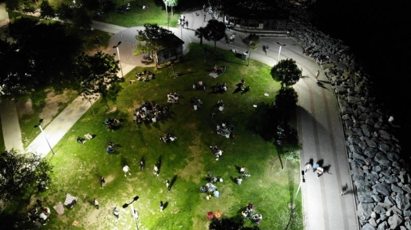 Koronavirüsle mücadele kapsamında getirilen hafta sonu sokağa çıkma kısıtlamasının sona erdirilmesiyle birlikte, vatandaşlar gün boyu sahilleri doldururken gece boyu da Moda Sahilindeki yoğunluk devam etti. Moda sahilde yürüyüş yapan ve oturan vatandaşlar drone ile havadan görüntülendi.