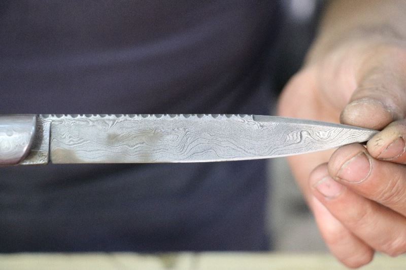 Çeliği müşterinin talebine göre değiştirdiklerini ifade eden Argut, sadece bıçakların kasasında kullandıkları çeliklerin sabit çelikler olduğunu söyledi. Bıçak ustası Argut, kasanın üzerinde kullandıkları malzemelerin geyik boynuzu, yılan ağacı, fiber, manda boynuzu olabildiğini dile getirerek, “Müşterinin tercihine göre bıçağın sapı üzerindeki renkli malzemelerimiz var onu tercihe göre kullanıyoruz. Ben 8 aydır tasarımına uğraşıyorum. Şimdi elimdeki siparişe 1 aydır çalışıyorum. Bıçağın imalatı bıçağın adedine göre de değişiyor. Bir bıçağı ben 3 günde çıkarırım ama adet çoğaldıkça imalat süresi uzuyor. Üzerinde gördüğünüz desenler alt-üst kat dövme bir çelik vardır, Şam çeliği denir, İngilizce ‘damascus’ olarak geçer ve dünya genelinde çok meşhur bir çeliktir. Bu çelik alt-üst kat dövülerek kendi desenini içinden çıkartır’’ ifadelerini kullandı.