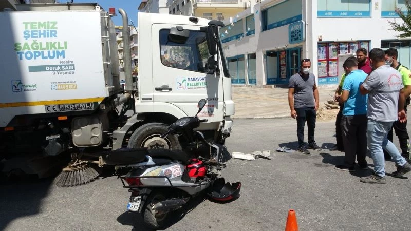 Antalya’nın Manavgat ilçesinde motosikletin belediyeye ait yol süpürme aracına çarpması sonucu meydana gelen kazada sürücü yaralandı. Kaza anı anbean güvenlik kameralarına yansıdı.