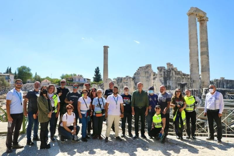 Didim’e gelerek Apollon Tapınağı’nı ziyaret eden motosiklet sürücülerini Didim Belediye Başkanı A.Deniz Atabay, Belediye Başkan Yardımcıları Öznur Gündoğdu ve Zeynel Şener karşıladı.