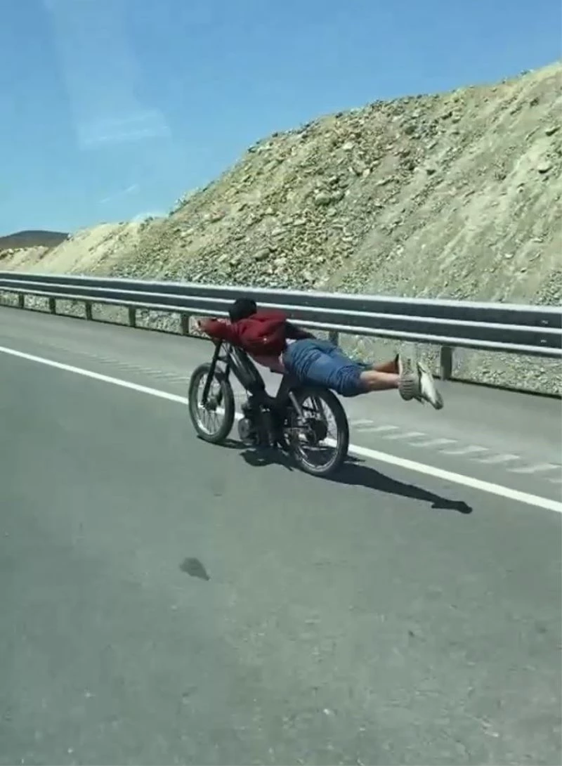 Olay, dün öğle saatlerinde Konya-Antalya yolu üzerinde yaşandı. Edinilen bilgiye göre, plakasız ve kasksız sürücünün motosikletinin üzerine yatarak kasksız yaptığı yolculuk korkuttu. Motosiklete yüz üstü kasksız yatan sürücü, hem kendini hem diğer araçlardaki sürücüleri tehlikeye attı. Olayı gören diğer araçlardakiler ise durumu cep telefonuna kaydetti. Sürücünün nereye kadar bu şekilde gittiği bilinmiyor. Görüntülerde, motosiklet üzerine yatan kasksız sürücünün tehlikeli yolculuğu yer alıyor.