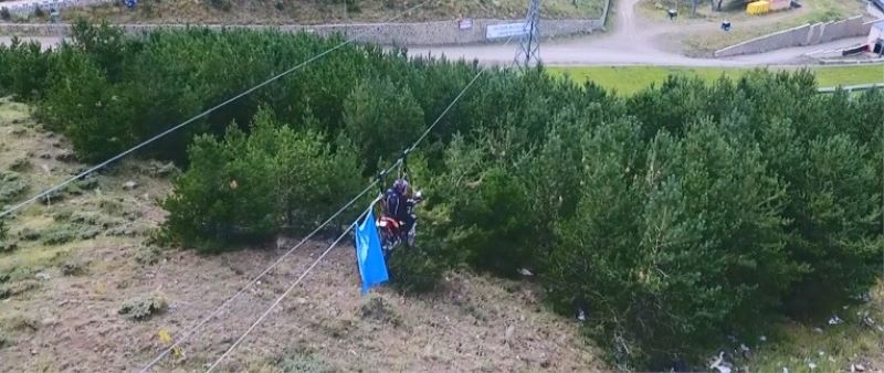 Erzurum’da bir macera sever Palandöken Dağı 2 bin 300 rakımda motosikletiyle zipline yaptı.