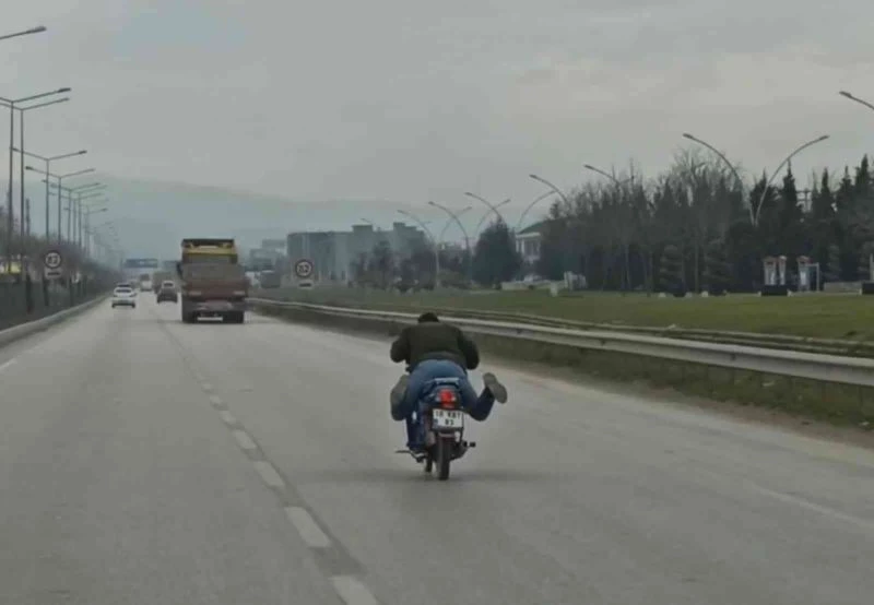 Bursa-Ankara yolunda Bursa yönüne giden kasksız sürücü, bir anda motosikletin üzerine yüzüstü yattı. Motosikleti bir süre yüzüstü uzanarak kullanan ve zaman zaman hızını artıran kasksız sürücüyü görenler, cep telefonu kamerasıyla görüntü çekti. Tehlikeli yolculuğun görüntülerini izleyen sosyal medyada kullanıcılarından şahsa tepki yağdı.