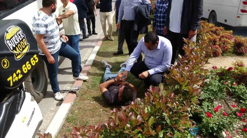 Antalya’nın Manavgat ilçesinde sipariş dönüşündeki motosikletli kurye, otel servisi ile refüj arasında sıkıştı. Yaralanan kuryenin yardımına, caddede seçim çalışması yapan AK Parti ekibi koştu.