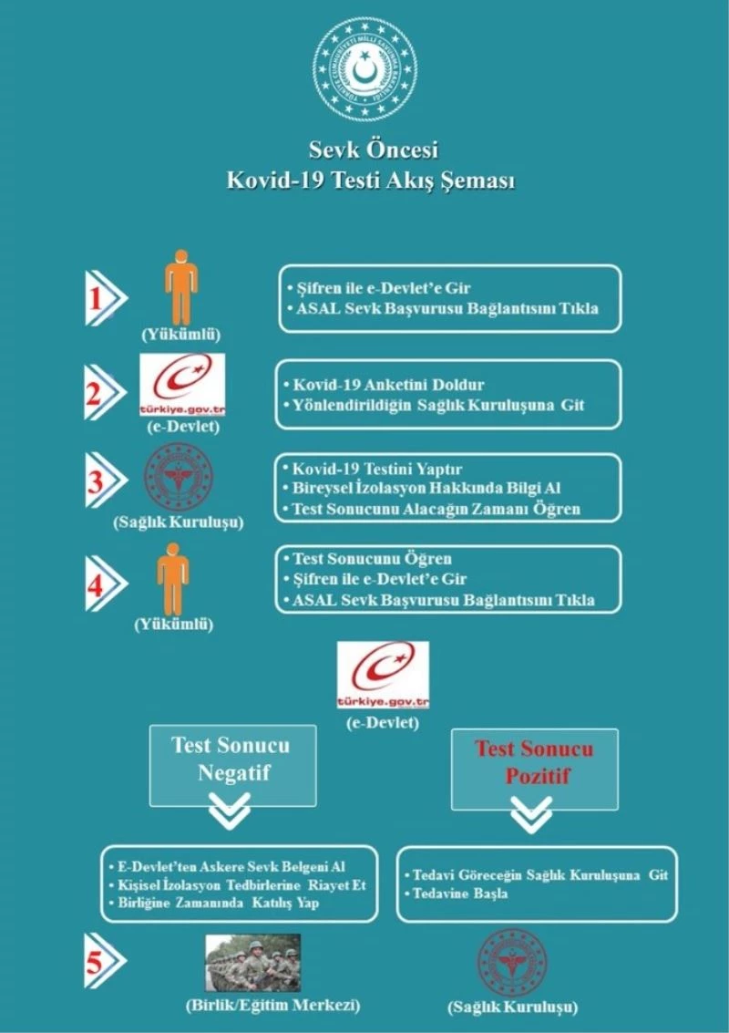 MSB tarafından yapılan açıklamada belirtilen yükümlülerle ilgili, “Yükümlüler; sevk tarihlerinin dört gün öncesinden itibaren e-Devlet’ten Covid-19 anketini dolduracaklar. Anket sonrasında yönlendirildikleri sağlık kuruluşlarında Covid-19 testlerini yaptıracaklar. Test sonucu pozitif çıkanların veya temaslı listesinde yer alanların askere sevkleri tedavileri süresince ertelenecek. Test sonucu Covid-19 tanısı ve şüphesi bulunmayanlar sevk belgelerini e-Devlet’ten alabilecek. Sevk belgesini alanlar birliğine katılıncaya kadar Covid-19 kapsamında Devlet kurumları tarafından duyurulan tüm tedbirlere uyacaklar. Asker eğlencesi, uğurlaması ve benzeri faaliyetleri icra etmeyecekler. Sağlık kuruluşlarında gerekli testleri yaptırmayanlar askere sevk edilmeyecek ve haklarında bakaya işlem uygulanacaktır. Covid-19 salgını nedeniyle; bulaşma riskini ortadan kaldırmak ve teması en aza indirmek maksadıyla sevk sürecindeki tüm işlemler e-Devlet’ten yapılacak, zorunlu durumlar dışında askerlik şubelerinde işlem yapılmayacaktır” ifadelerine yer verildi.