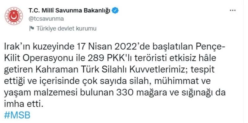Milli Savunma Bakanlığı, Irak’ın Kuzeyinde 17 Nisan’da başlatılan Pençe-Kilit Operasyonunda bugüne kadar 289 PKK’lının etkisiz hale getirildiğini ve 330 mağara ile sığınağın imha edildiğini duyurdu. Konuyla ilgili bir de video yayınlayan MSB, videoda operasyonlar çerçevesinde ele geçirilen malzemeler ve mühimmatlara ilgili bilgilere ve görüntülere yer verdi. Yapılan açıklamada ise, “Irak’ın kuzeyinde 17 Nisan 2022’de başlatılan Pençe-Kilit Operasyonu ile 289 PKK’lı teröristi etkisiz hale getiren Kahraman Türk Silahlı Kuvvetlerimiz; tespit ettiği ve içerisinde çok sayıda silah, mühimmat ve yaşam malzemesi bulunan 330 mağara ve sığınağı da imha etti” denildi.