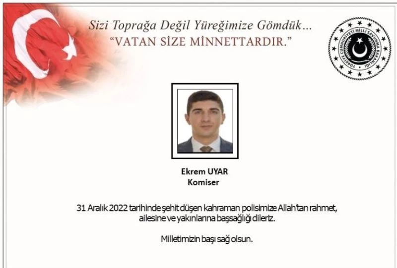 Milli Savunma Bakanlığı’nın (MSB) resmi sosyal medya hesabından Şehit Polis Ekrem Uyar için başsağlığı mesajı yayımlandı.