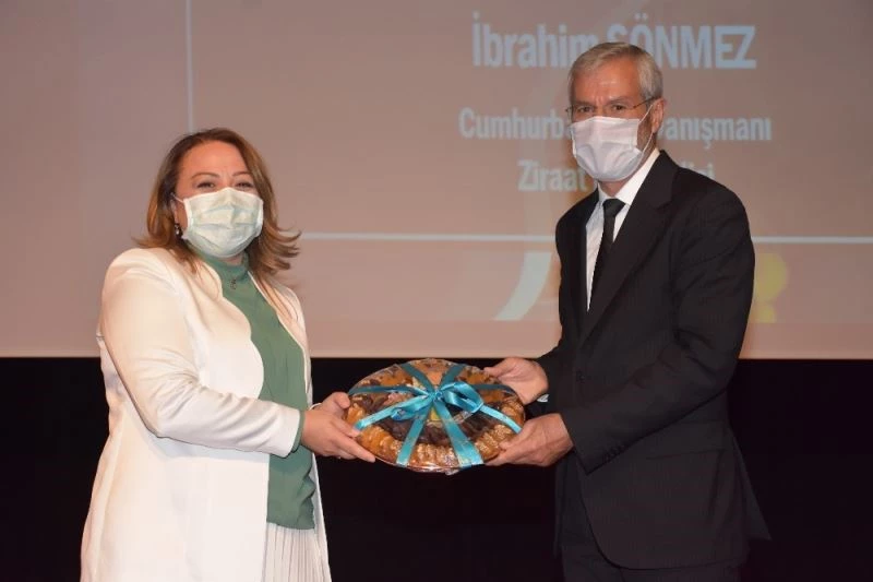Rektör Prof. Dr. Karabulut, konferansın anısına Cumhurbaşkanı Danışmanı Ziraat Mühendisi İbrahim Sönmez’e tablo, kayısı ve saksıda çiçek hediye etti.