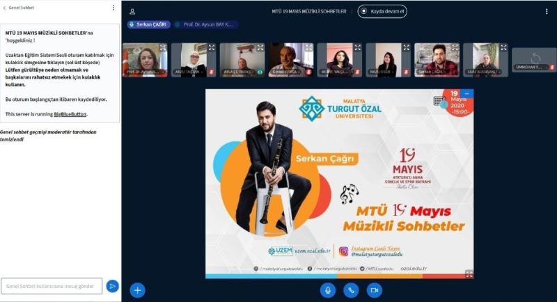 Malatya Turgut Özal Üniversite (MTÜ) 19 Mayıs Atatürk’ü Anma Gençlik ve Spor Bayramı etkinlikleri kapsamında ünlü klarnet sanatçısı Serkan Çağrı, uzaktan eğitim sistemi üzerinden sohbet ve mini konser etkinliğine katıldı.