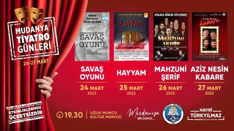 Mudanya Tiyatro Günleri başlıyor. Mudanya Belediyesi, 24-27 Mart tarihlerinde 4 farklı oyunu tiyatroseverlerle buluşturuyor. Mudanya Tiyatro Günleri kapsamında Mudanya Kent Konseyi oyuncuları “Savaş Oyunu” ile 24 Mart’ta, Ekim Sanat oyuncuları “Hayyam” ile 25 Mart’ta, Ankara Birlik Tiyatrosu oyuncuları “Mahzuni Şerif” ile 26 Mart’ta, İzmir Halk Tiyatrosu oyuncuları “Aziz Nesin Kabare” ile 27 Mart’taUğur Mumcu Kültür Merkezi’nde seyirciyle buluşacak. Mudanya Tiyatro Günleri etkinlikleri kapsamında Cengiz Toraman’ın yönettiği Levent Üzümcü, Ali Hakan Beşen, Mehmet Küçükgünaydın ve Cengiz Toraman’ın sahnelediği “Aziz Nesin Kabare”, Ali Öztunç’un yazdığı, Gül Göker’in oyunlaştırdığı, Murat Sarı’nın yönettiği “Mahzuni Şerif”, Ömer Naci Topçu’nun yazıp yönettiği “Hayyam” ile Mudanya tiyatroya doyacak.