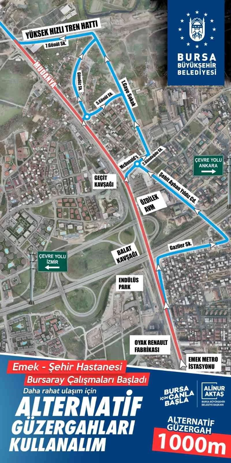 "Sanayi Caddesi’nin, Mudanya Yolu gidiş istikameti, BursaRay Emek istasyonu ile Otoyol girişi arası 1. Etap çalışma alanı olarak belirlendi. Mudanya Yolu Caddesinde Bursaray Emek İstasyonu ile Otoyol Girişi arasında, trafik 4 şeritli servis yoluna alınacak. Mudanya Yolu üzerinden yaya geçişleri Emek-BursaRay Hafif Raylı Sistem istasyonundan sağlanacak. Mudanya Yolu üzerinde bulunan Sanayi Caddesi 4 ( D0732 ) otobüs durağı, servis yolu üzerinde 329. Sokak öncesinde oluşturulan geçici durak noktasına taşınacak. Bu etapta trafik aktarımının yapıldığı süre boyunca, BursaRay Emek İstasyonu ile Otoyol girişi arasında trafik akışının aksatılmaması hedefiyle, Emek Fatih Sultan Mehmet ve Geçit mahalleleri sınırları içerisinde yer alan Şht. Kom. Er Ramazan Okur Cad, 21. Çiçek Sokak, Alev Sokak, Gürel Sokak ve 7. Akar Sokağın oluşturulan servis yoluna giriş ve çıkışları kapatılacak. Mahallelere giriş ve çıkışlar 329. Sokak ve Genç Osman Caddesi üzerinden sağlanacak. Trafik aktarımının yapıldığı güzergah boyunca duraklama ve park etmek yasaklanırken, konuya ilişkin denetim Trafik Denetleme Şube Müdürlüğünce aralıksız yapılacak."