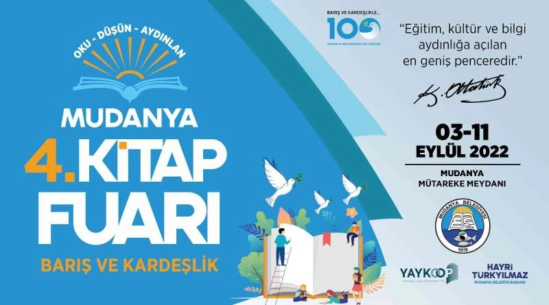 Mudanya 4. Kitap Fuarı; bu yıl “Barış ve Kardeşlik” temasıyla 3 Eylül Cumartesi günü kapılarını açıyor. Mudanya Belediyesi ve YAYKOOP işbirliğinde 3-11 Eylül tarihleri arasında Mütareke Meydanı ve İsmet İnönü Parkı’nda düzenlenecek olan kitap fuarı çerçevesinde 62 yayınevi ile 47 akademisyen, gazeteci-yazar Bursalı kitapseverlerle buluşacak.