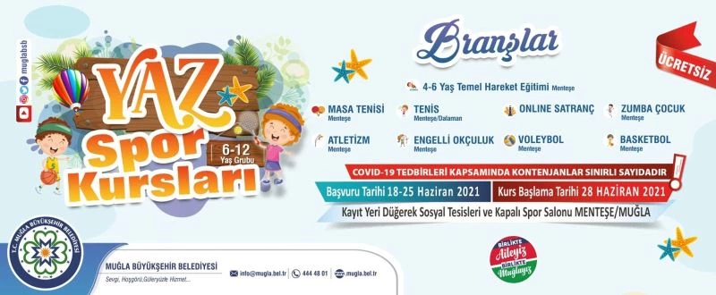 6-12 yaş arası çocuklara hafta içi her gün Menteşe’de masa tenisi, tenis, atletizm, engelli Okçuluk, voleybol, basketbol, zumba çocuk ve online satranç branşlarında kurs verilecek. Pandemi tedbirleri çerçevesinde düzenlenecek olan yaz spor kurslarının başvuruları 18-25 Haziran 2021 tarihleri arasında Menteşe Düğerek Sosyal Tesisleri ve Kapalı Spor Salonuna yapılacak.