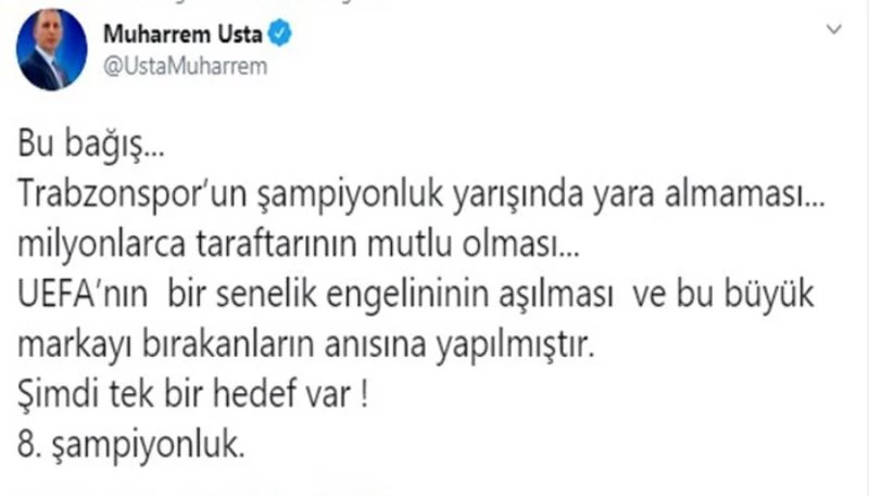 Eski başkan Muharrem Usta, kendisine ait sosyal medya hesabından yaptığı paylaşımda şu ifadelere yer verdi: "Bu bağış, Trabzonspor’un şampiyonluk yarışında yara almaması, milyonlarca taraftarının mutlu olması, UEFA’nın bir senelik engelinin aşılması ve bu büyük markayı bırakanların anısına yapılmıştır. Şimdi tek bir hedef var, 8. şampiyonluk."