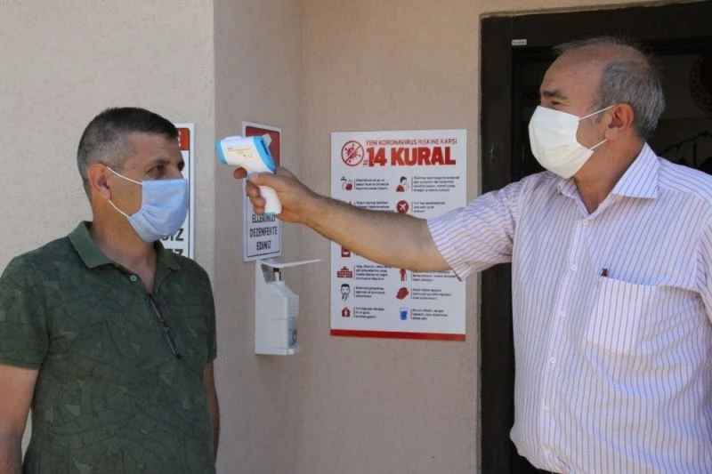 Korona virüs (Covid-19) salgını ile mücadele kapsamında Kazım Karabekir Mahalle Muhtarı Oğuz Tekcan, muhtarlık binası girişine dezenfektan, maske uyarı yazılarını asıp, gereken tedbirleri aldıktan sonra mahalle sakinlerinin de ateşlerini ölçerek içeri alıyor.