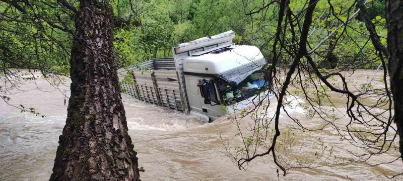 Kamyon, vinç yardımıyla sudan çıkarıldı.