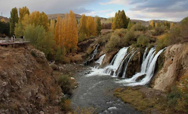Van’ın Muradiye ilçesinde sonbahar mevsimiyle birlikte, sararan ağaçların arasında gürül gürül akan şelale seyrine doyulmaz bir güzellik oluşturuyor.