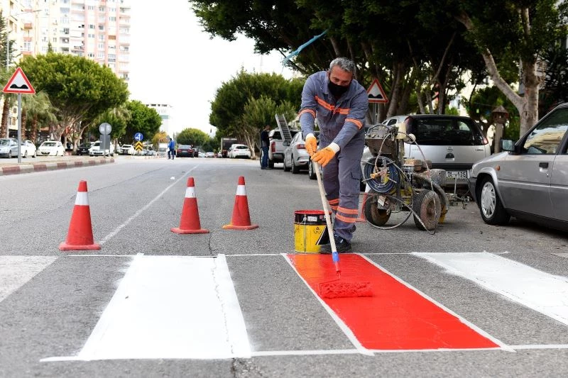 Muratpaşa Belediyesi, yayaların geçiş üstünlüğüne dikkat çekmek için İçişleri Bakanlığı’nca başlatılan kırmızı çizgi uygulaması kapsamında Meltem Mahallesi’ndeki ışıksız yaya geçitlerine kırmızı çizgiyi çekti.