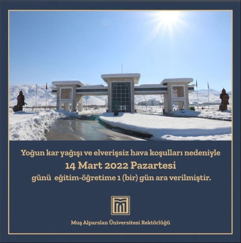 Muş Alparslan Üniversitesi’nden yapılan açıklamada, yoğun kar yağışı ve elverişsiz hava koşulları nedeniyle 14 Mart 2022 Pazartesi günü eğitim öğretime bir gün ara verildiği ifade edildi.