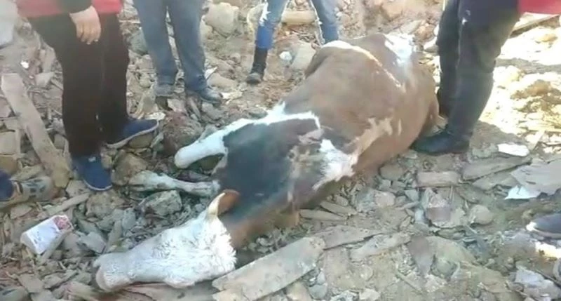 Muş Valiliği koordinesinde Kahramanmaraş’ın Nurhak ilçesinde deprem sonrası arama kurtarma ve enkaz kaldırma çalışmalarını devam ettiren ekipler, bir büyükbaş hayvanı canlı olarak enkaz altından çıkardı.