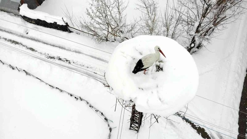 Uzun göç sürecinin ardından yaz boyunca kuluçkaya yatmak için Muş Ovası’na gelen baharın müjdecisi leylekler, yoğun kar yağışına yakalandı.