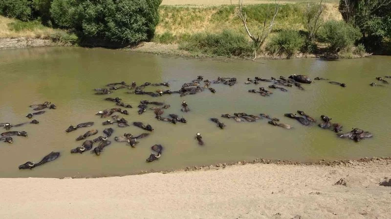 Muş’ta sıcak havadan etkilenen mandalar, bunaltıcı sıcaktan kurtulmak için günün büyük bir bölümünü Karasu Nehri’nde geçirerek serinliyor.
