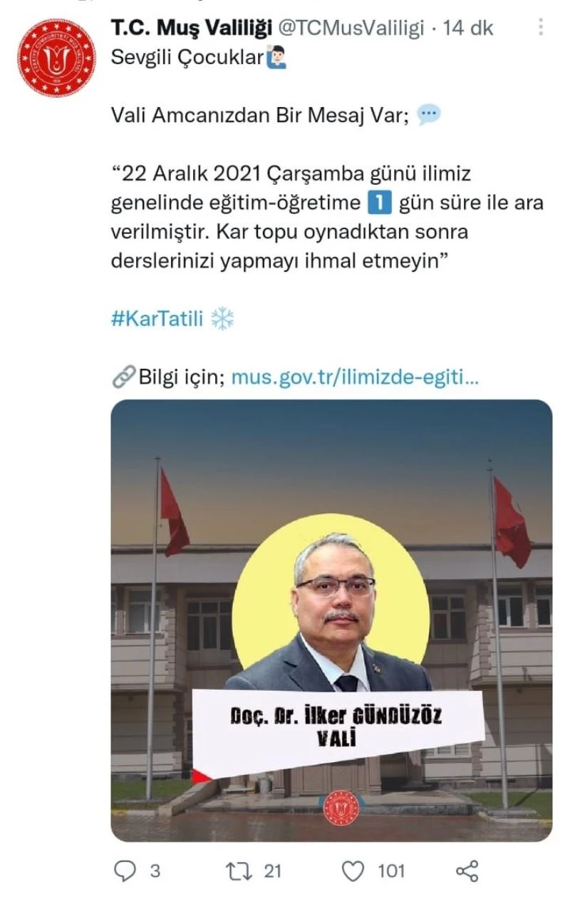 Muş Valiliğinin resmi Twitter hesabından öğrencilere bir mesaj yollayan Vali İlker Gündüzöz, “22 Aralık 2021 Çarşamba günü eğitim-öğretime 1 gün süre ile ara verilmiştir. Kartopu oynadıktan sonra derslerinizi yapmayı ihmal etmeyin” dedi.