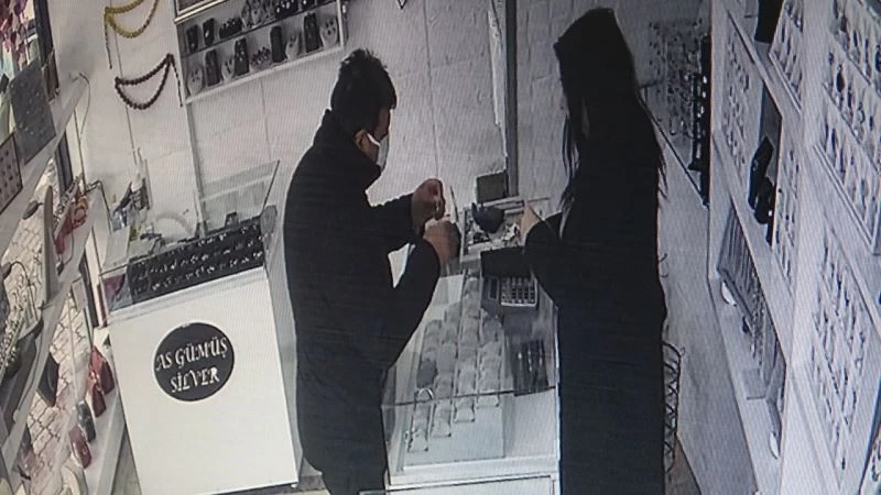 Olay, ilçe merkezindeki bir gümüş takı dükkanında meydana geldi. Cerrahi maskeli bir kişi, müşteri gibi girdiği dükkanda 3 bin 500 lira değerinde gümüş takı beğendi. Çalışana, bitişikteki lokantadan geldiğini söyleyen şahıs, 10 yaşındaki oğluna gösterip geri geleceğini söyledi. Dışarıya çıkan şüpheli geri gelmeyince lokantaya bakan çalışan şahsın gümüşlerle kayıplara karıştığını fark edince durumu polise ve dükkan sahibine bildirdi. Polis, güvenlik kamerasına yansıyan hırsızlık şüphelisini yakalamak için çalışma başlattı.