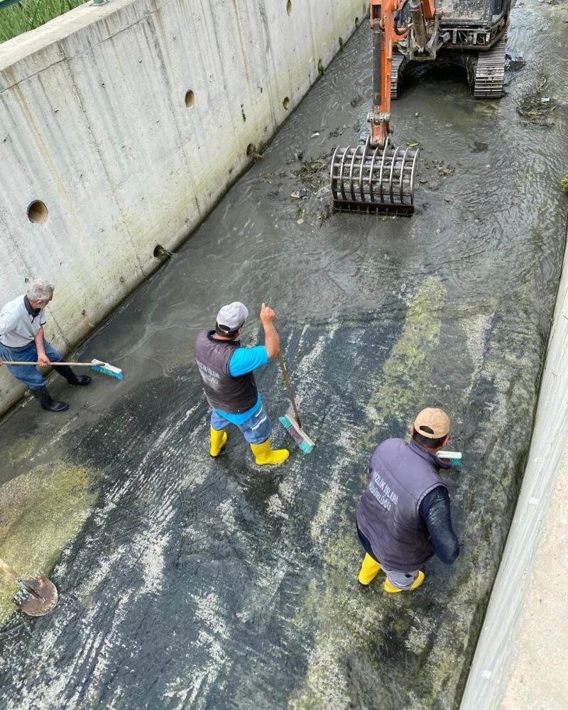 Tabanında bir metreye yakın balçık biriken, içerisinden otlar ve ağaçlar çıkan dere, iş makineleri temizleniyor.