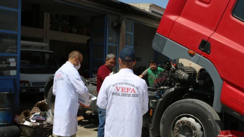 Mut Kaymakamligindan yapilan açiklamaya göre, Vefa Sosyal Destek Grubu ekiplerince ilçedeki sanayi sitesi ve toptanci hali esnafina maske dagitildi.