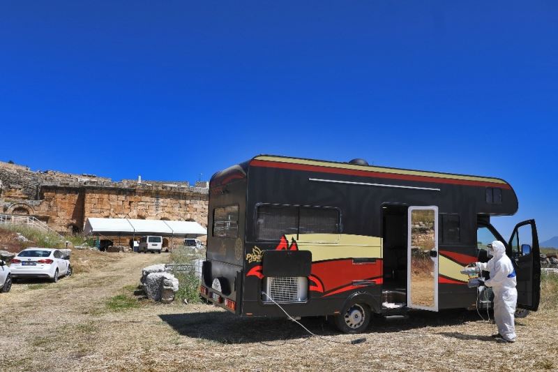 Cumhurbaşkanlığının, “7 Tepeden 7 Kıtaya” projesiyle beyaz cennet Pamukkale’de de düzenleyecek olduğu konser öncesinde Denizli Büyükşehir Belediyesi ekipleri, yaklaşık 2 bin 500 yıllık geçmişe sahip Hierapolis Antik Tiyatro’da dezenfeksiyon çalışması yaptı.