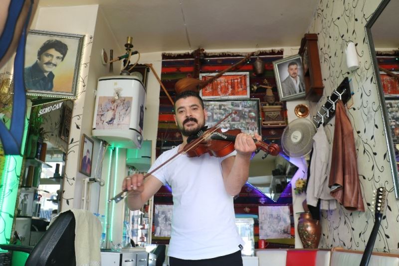 Sivas’ta bir berber müşterilerini hem traş ediyor hem de onlara çeşitli müzik aletleri çalarak müzik ziyafeti yaşatıyor.