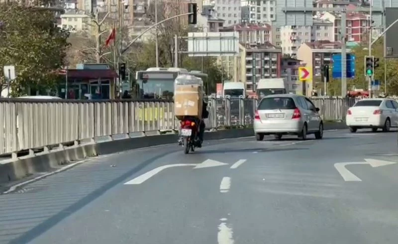 Eyüp’te motosikletinin arkasına yüklediği koli ve yüklerle trafiğe çıkan sürücünün tehlikeli yolculuğu kameraya yansıdı.