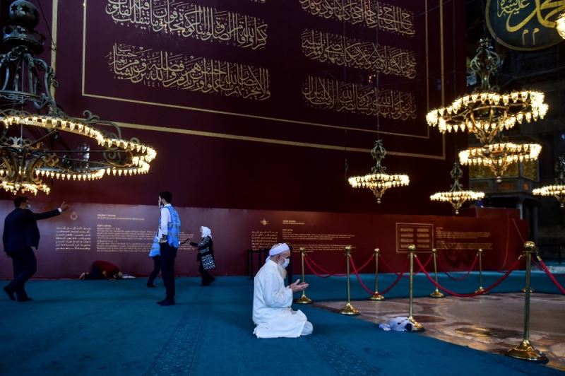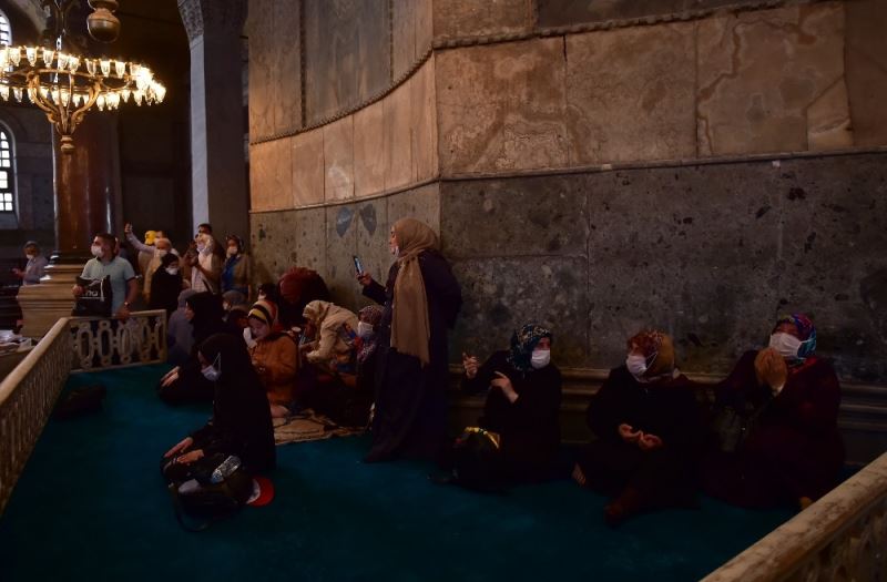 İbadete açılan Ayasofya-i Kebir Cami-i Şerifi içerisine namazın bitmesiyle vatandaşlar kısım kısım içeriye alınmaya başladı. Cami içerisinde bulunan freskleri kapatan perde düzeni de kameraya yansıdı.