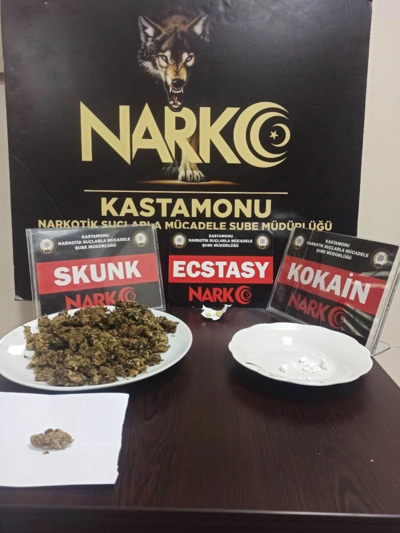 Edinilen bilgiye göre, Kastamonu İl Emniyet Müdürlüğü Narkotik Suçlarla Mücadele Şube Müdürlüğü ekiplerince, 17 Haziran günü iki şahsın yapılan üst ve oto aramalarında 2 adet Extacy, 2.14 gram taş kokain, 97.57 gram gelen Skunk maddeleri ele geçirildi. Şahıslar gözaltına alınarak adli mercilere sevk edildi.