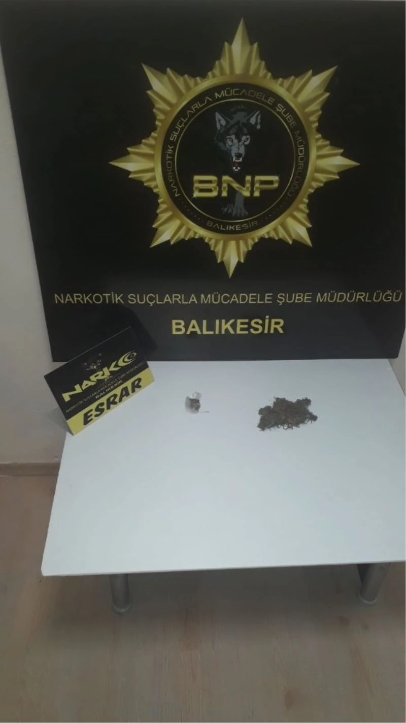 Balıkesir İl Emniyet Müdürlüğü Narkotik Suçlarla Mücadele Şube Müdürlüğü ile Asayiş Şube Müdürlüğü motorize ekipleri, yapılan kontroller sırasında şüpheli bir aracı tespit etti. Tespit edilen araçta yapılan aramada narkotik köpeği Bath, ön yolcu koltuk iç kısmına tepki verdi. Bunun üzerine araçta detaylı arama yapıldı. Aracın ön koltuk kısmında 20.76 gram esrar ile 10 adet uyuşturucu hap ele geçirdi.