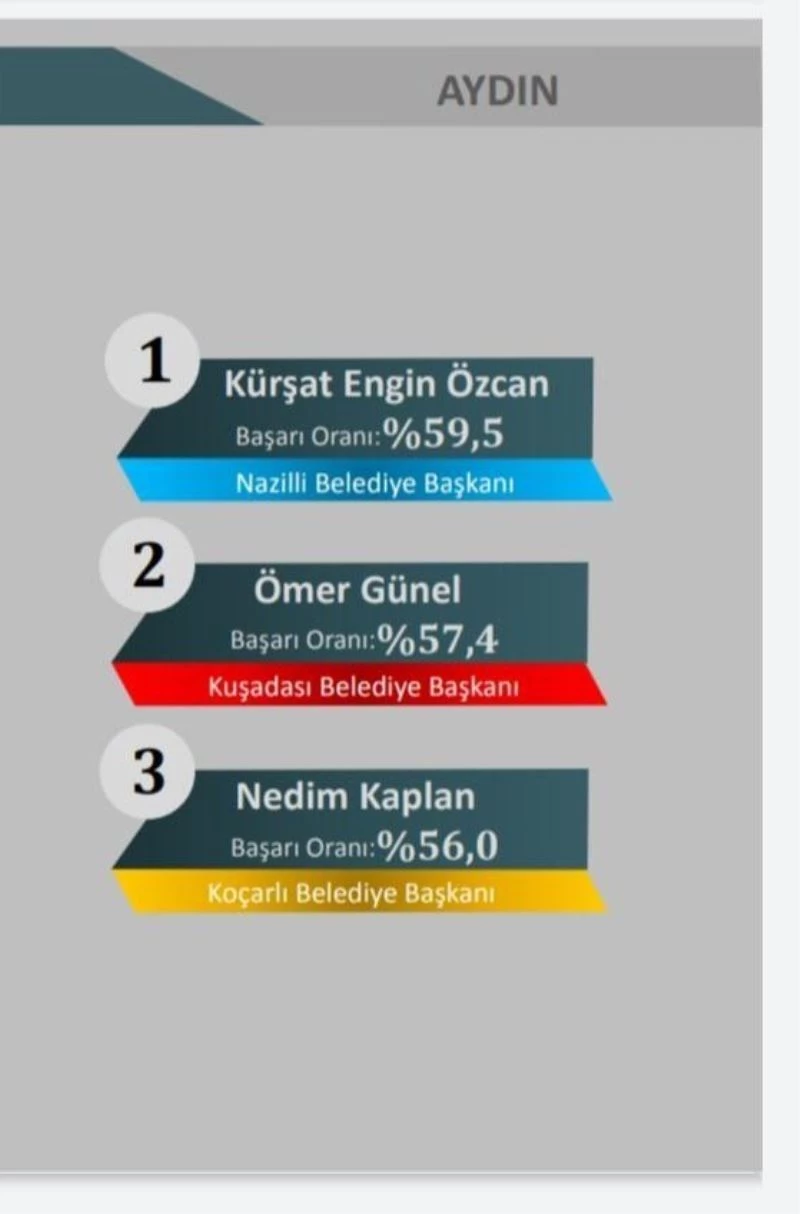 Firma tarafından 30 büyükşehirde, 01-15 Ağustos tarihleri arasında 23 bin 200 katılımcı ile yüz yüze anket ve bilgisayar destekli telefon görüşmesi yöntemi ile gerçekleştirdiği belirtilen ankette yüzde 56 Başarı oranıyla 17 ilçe içerisinde Koçarlı Belediye Başkanı da 3. Sırada yer aldı.